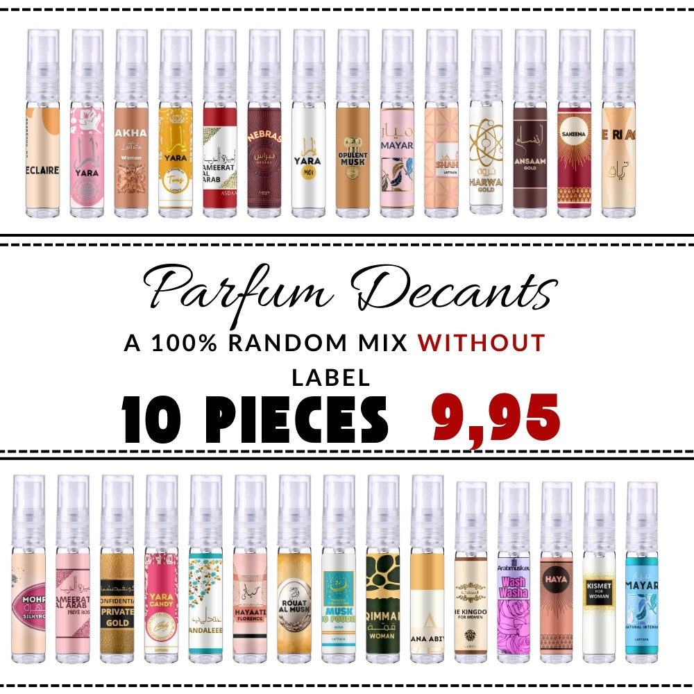 Alle samples zijn gemaakt van parfumflessen uit de assortiment van Arabmusk.eu. Het gaat om restanten die ontstaan zijn bij het maken van de verschillende top 10 sets. De kans is dus groot dat je voornamelijke populaire parfums krijgt. Het is helaas niet mogelijk om achteraf door ons na te gaan om welke parfum het gaat.